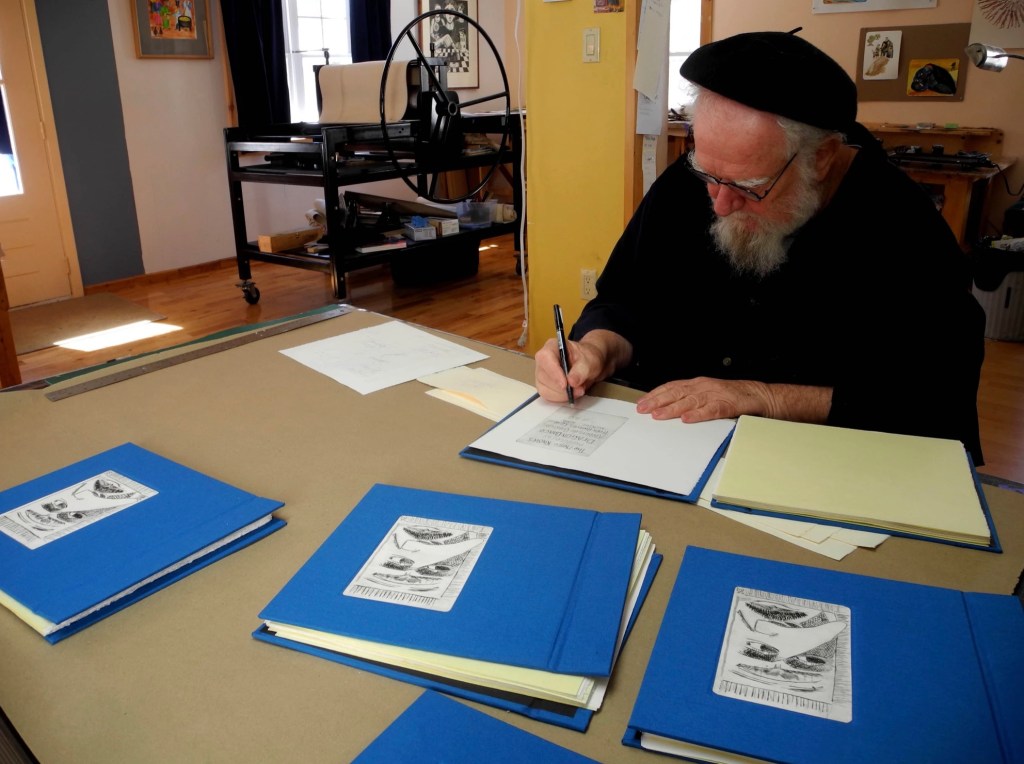Sam Kerson first approached us nearly a decade ago offering to share some linocut prints with us. At that time we, the Committee for Future Generations, were embattled by the Nuclear Waste Management Organization. We are the Poplar/Aspen Tree Home Dene (English River First Nation). The Nuclear waste management Organization was soliciting us to allow them to build a nuclear waste dump on our traditional territory.