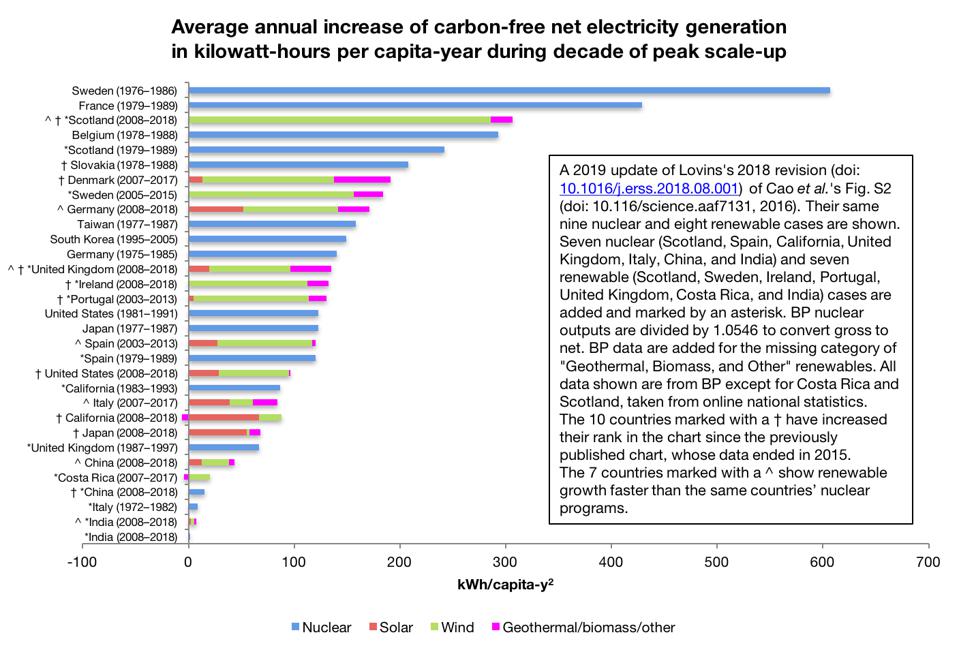 If, unlike the Science authors, we compare nuclear in ten countries with renewable growth in the same ten countries, renewables are faster in seven. But rapid nuclear growth occurred over three decades ago under conditions that no longer exist, while comparable or faster renewable growth is here, now, and accelerating. (In two years, China and India have just both increased their renewable generation by more than all their nuclear plants produced in 2018.)