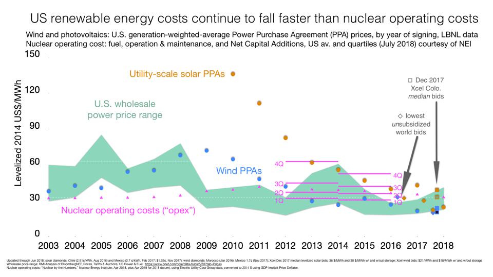 During two recent three-year periods, the magenta horizontal bars reported by the Nuclear Energy Institute show that those average nuclear operating costs by quartile fell as the worst reactors were closed—but renewable prices fell even faster. Nuclear operating costs will be hard to cut much further in reactors averaging four decades old, but renewable prices promise strong further declines for decades to come. International nuclear operating costs tend to be even higher.