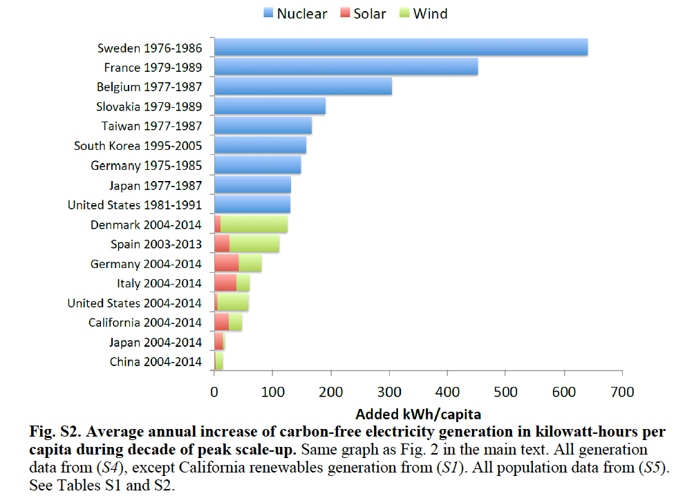 A 2016 paper with some distinguished coauthors in the leading journal Science used that methodology—more suited to comparing countries than technologies—to claim in this widely republished graph that nuclear growth is generically “much faster” than renewable growth: