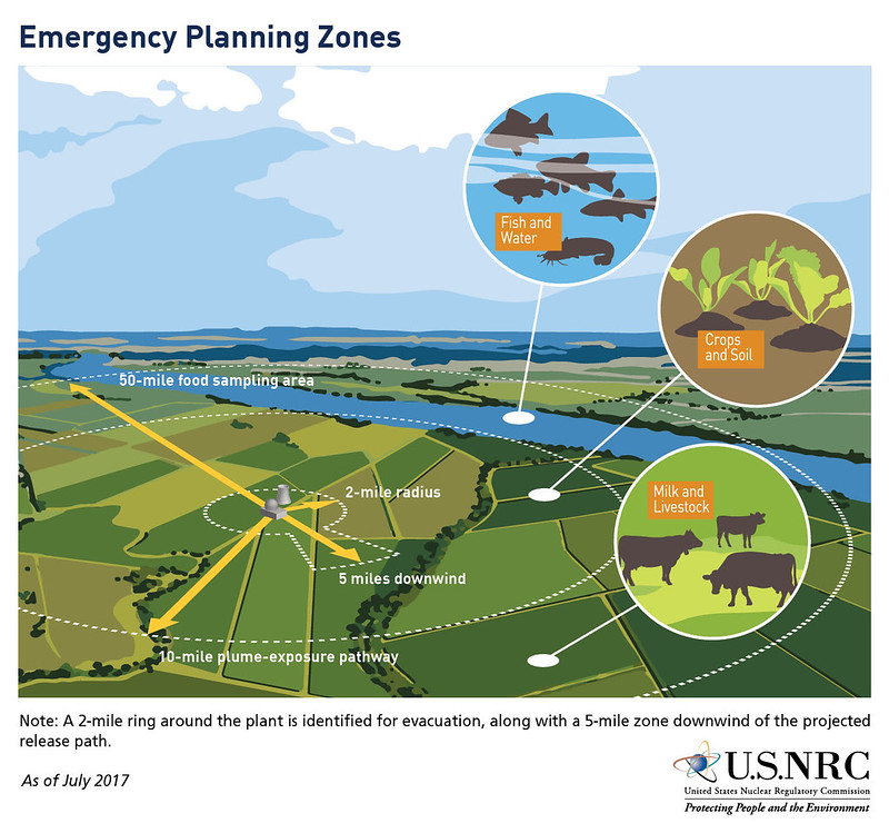 For the last 40 years, NRC has required emergency planning zones, or EPZs, (Emergency Planning Zones) around nuclear power plants “to assure that prompt and effective actions can be taken to protect the public in the event of an accident.” Every one of the 96* operating large light-water reactors in the country has a plume exposure pathway EPZ that extends about 10 miles around the site with dedicated offsite radiological emergency plans and protective actions in place to avoid or reduce radiation dose to the public during an accident. An ingestion exposure pathway EPZ with a radius of 50 miles around each of these sites is designed to avoid or reduce dose from consuming food and water contaminated by a radiological release.