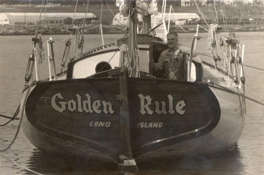 In 1958, the Golden Rule sailed from San Pedro, California toward the U.S. nuclear test zone at Eniwetok atoll in the Marshall Islands, but she never made it that far. The first time out of San Pedro Capt. Albert Bigelow, George Willoughby, William Huntington and David Gale were aboard. A week into the voyage the starboard jaw of the gaff broke.