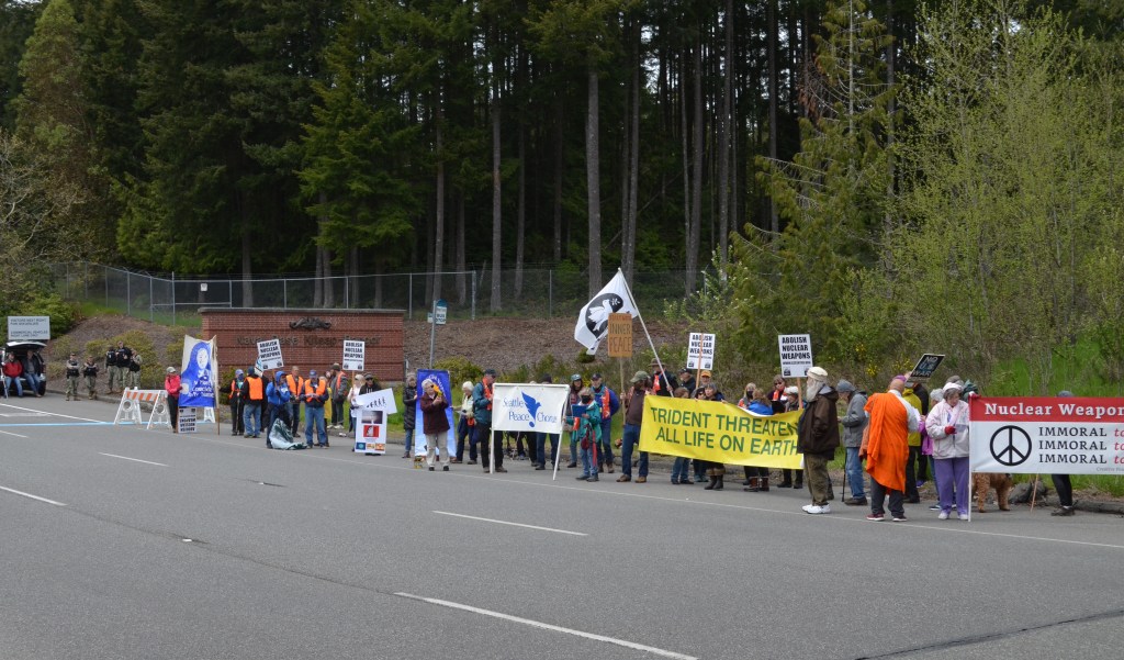 Over 50 people were present on May 7 at the demonstration against Trident nuclear weapons at the Bangor submarine base. Nine demonstrators blocked the main highway entrance into the base for about 10 minutes and were cited by the Washington State Patrol.