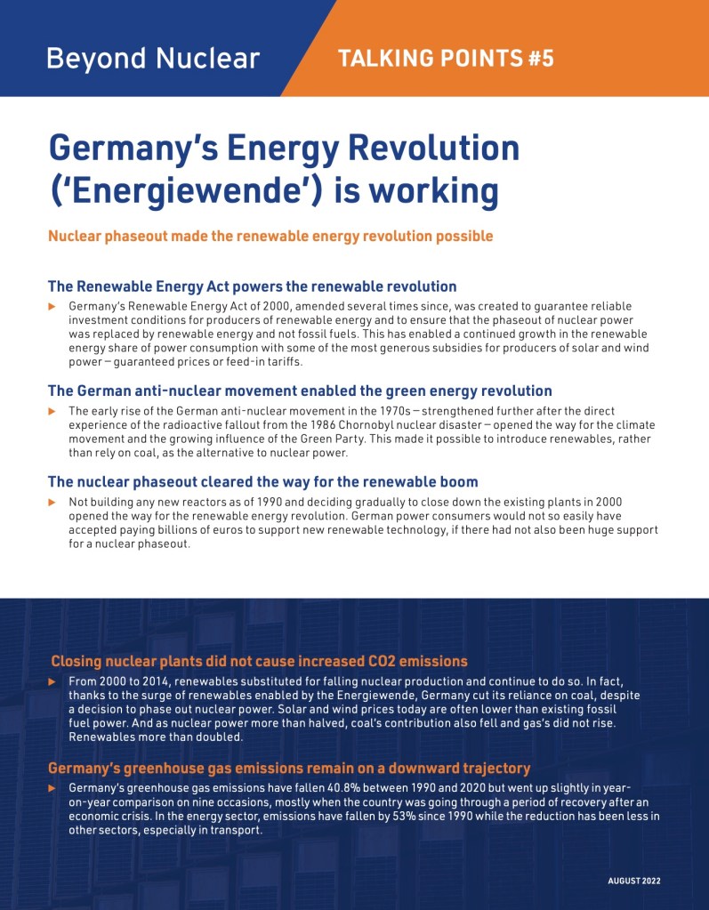 This week, Beyond Nuclear introduces the fifth in our series of Talking Points: Germany’s Energy Revolution (’Energiewende’) is working.