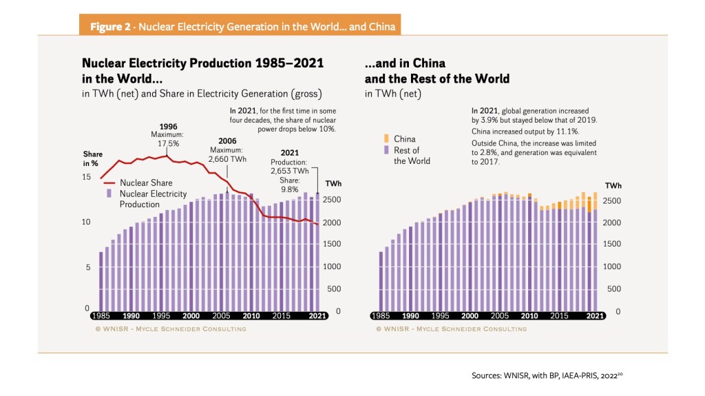 The over-riding finding of the 2022 edition of the report is that nuclear power’s share of global commercial gross electricity generation in 2021 dropped to below 10 percent for the first time ever, sinking to its lowest in four decades.