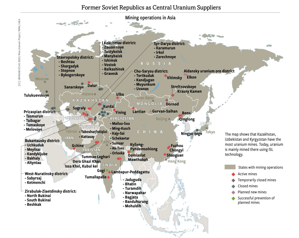 The recently updated version of the Uranium Atlas (in German), is published by the Bund für Umwelt und Naturschutz Deutschland (BUND) together with the Nuclear Free Future Foundation, the Rosa Luxemburg Foundation, Greenpeace and “.ausgestrahlt”. According to the report, around 40 per cent of European uranium imports come from Russia and Kazakhstan. Thus, in addition to fossil energy imports, European countries are significantly dependent on Russia.