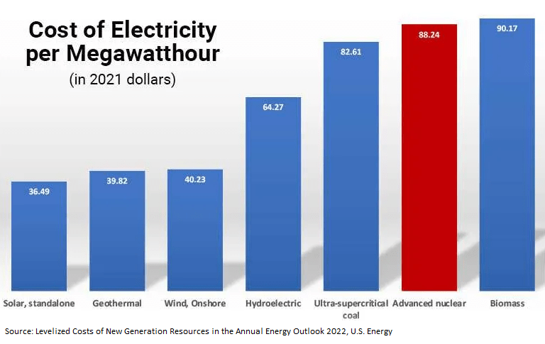 To understand the economic problem, consider the only two nuclear reactors being built in the United States. These are in the state of Georgia, and the cost of constructing these has ballooned from an initial estimate of $14 billion to over $30 billion.