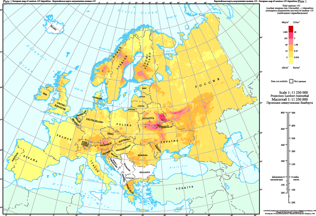 How far radiation from another nuclear power plant disaster in Ukraine would spread depends on the direction of the wind and on where precipitation occurs. What is striking about the Chornobyl fallout map is just how selective and seemingly random it is once we are beyond the borders of the former Soviet Union. Austria got heavily dosed, for example, its immediate neighbors less so. Sweden, Norway and Finland suffered major hotspots while Denmark was largely spared.