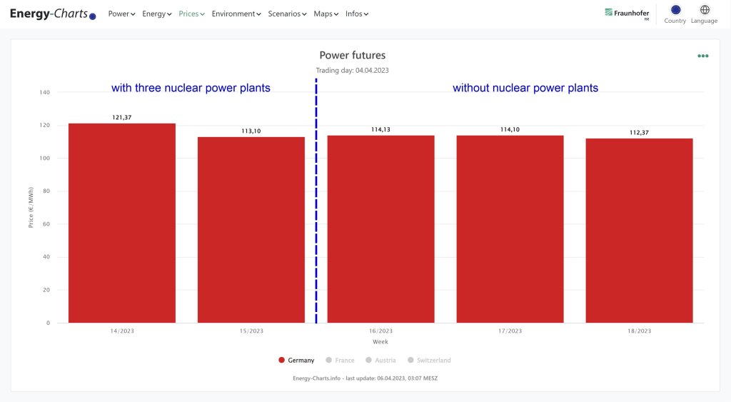 This did not change after Germany’s last three reactors closed. As Bruno Burger of Energy Charts noted as a caption to the graphic below: “The shutdown of the last three German nuclear power plants has no visible effect on weekly Future Electricity Prices in Germany.”