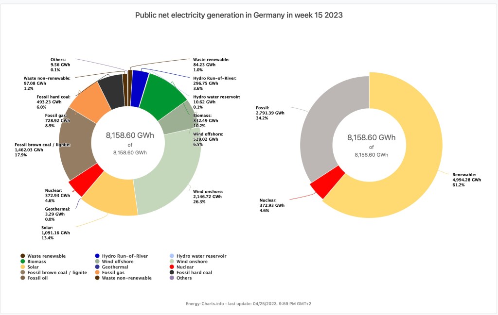 In 2000, the renewables share in German electricity was just over 6%. The nuclear share was 30%. In just 23 years, those numbers have more than reversed, with today’s share of on- and off-shore wind plus solar at just over 46% and nuclear at 4.6% in the last week before the final reactor closures. Germany remains on track to achieve its carbon neutral goal by 2045.