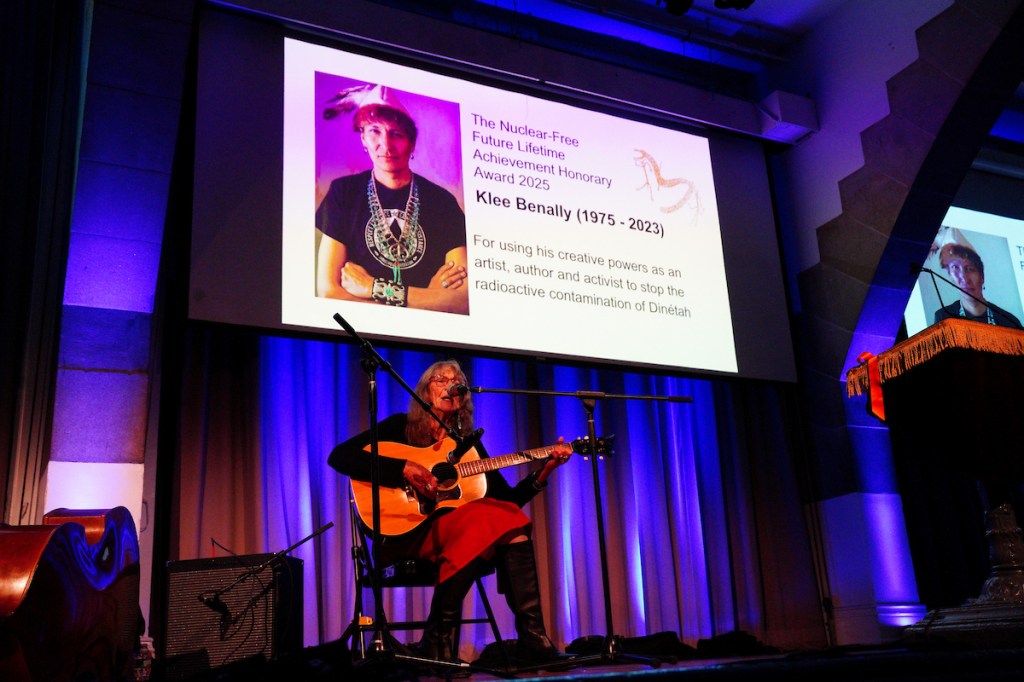 There were two other notable absentees on the night, both of whom received Lifetime Achievement Awards. Berta Benally sang and played for her lost son, Klee Benally, a force of nature and fiery determination, a Diné warrior for peace and justice who died in December of 2023. Klee, like his mother, was a musician, as well as a filmmaker, author and the creator of board games, all designed to tell the story of the colonial invasion of Diné lands and the tragic consequences for his people.