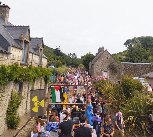 The highlight of the weekend was a demonstration on Saturday afternoon against Aval du Futur and, more broadly, the ever-increasing nuclearization of the region. In keeping with its offbeat and militant approach, the Piscine Nucléaire Stop collective decided to draw on the local legend of the little fairies and their method of collective self-defense armed with heather and gorse to confront an offense: the paving over of the last remaining primary moors on the La Hague plateau and the accumulation of nuclear waste by Orano.