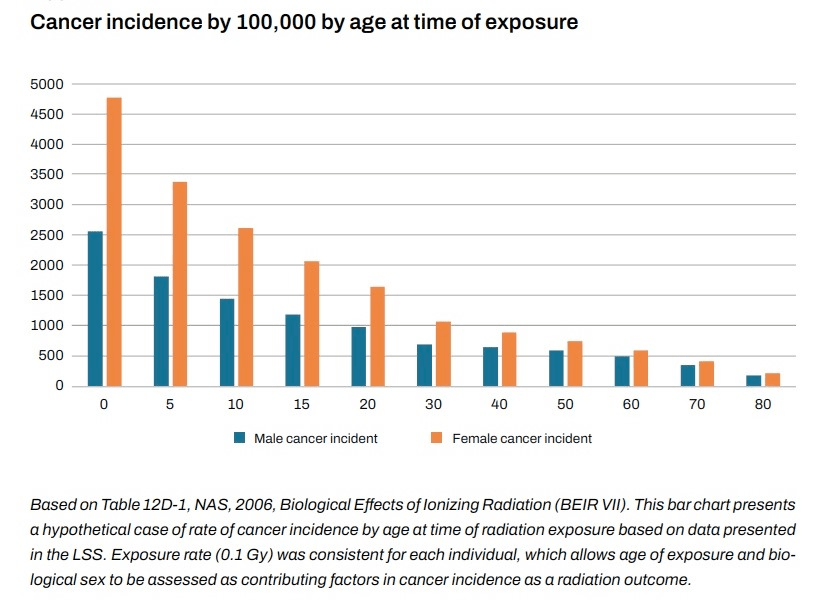 These findings are particularly striking because they were based on studies of nuclear workers, a part of the adult population and predominantly male that research has shown are at less risk from radiation exposure. Therefore, these studies do not adequately reflect the heightened vulnerabilities of women, children, and pregnancy to cancer or other radiation-associated diseases.