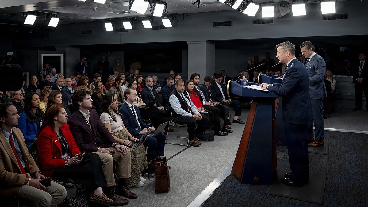 Headline photo: Secretary of War Pete Hegseth and Chairman of the Joint Chiefs of Staff Gen. Dan Caine hold a press conference at the Pentagon about Epic Fury, March 19, 2026. (Photo: D. Applebaum/Wikimedia Commons.)