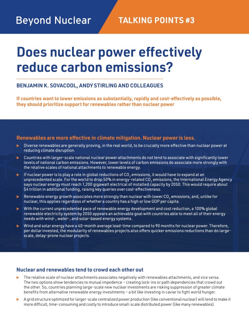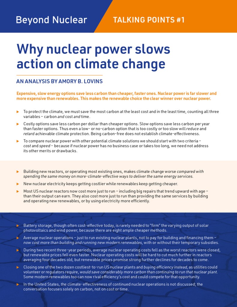 Nuclear power has no place among climate solutions. Indeed, choosing to stick with existing nuclear plants – and building new ones – actually makes climate change worse. There are many excellent – but sometimes long and detailed – reports that make the definitive case for renewables over nuclear. To render these more accessible, Beyond Nuclear is choosing a selection to condense into manageable Talking Points. We hope you will find these useful in outreach to elected officials and the public, for presentations and in your media work. Watch for new additions to our series as they are published in the coming months. Please feel free to download, print and distribute our Talking Points.