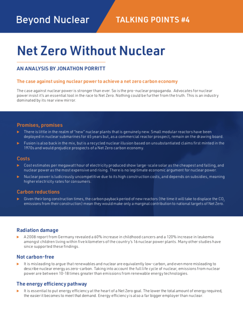 Talking Points #4: Net zero without nuclear. It’s not only possible, but essential. An analysis by Jonathon Porritt. The fourth in our Talking Points series looks at how energy efficiency and renewables must be at the heart of a Net Zero goal. Nuclear has no role to play and clinging to inflexible baseload distribution systems, on which nuclear power relies, makes it harder to bring on renewables.