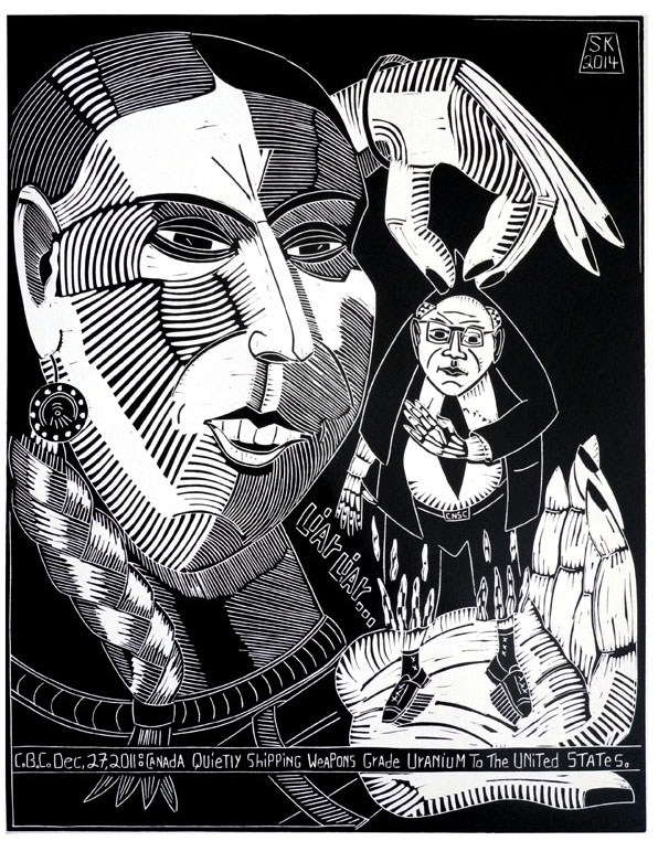 Sam Kerson first approached us nearly a decade ago offering to share some linocut prints with us. At that time we, the Committee for Future Generations, were embattled by the Nuclear Waste Management Organization. We are the Poplar/Aspen Tree Home Dene (English River First Nation). The Nuclear waste management Organization was soliciting us to allow them to build a nuclear waste dump on our traditional territory.