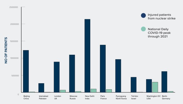 Nuclear-armed states may prepare to use nuclear weapons but they can never adequately prepare for the humanitarian consequences of their use. Examining the existing health infrastructure available to respond to the explosion of a moderately-sized nuclear weapon over nine cities in nuclear-armed states and one non-nuclear armed state’s capital makes this point tragically clear.
